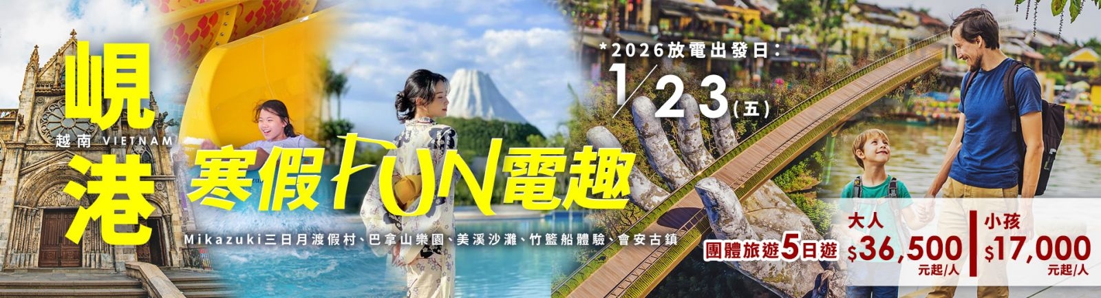 <2026 寒假親子限定 x 水上樂園渡假村爽爽玩> 出團日期:2026/01/23 (五) 團費報價:每位大人 38,500 元 2-5歲兒童不含餐 每位 17,000 元起 6-11歲兒童含餐 每位 27,500 元起 ✨寒假限定~早鳥優惠 ★ 45天前報名 第二人折4000,每位大人只要 36,500 元起 *僅大人正常佔床享有折扣 |